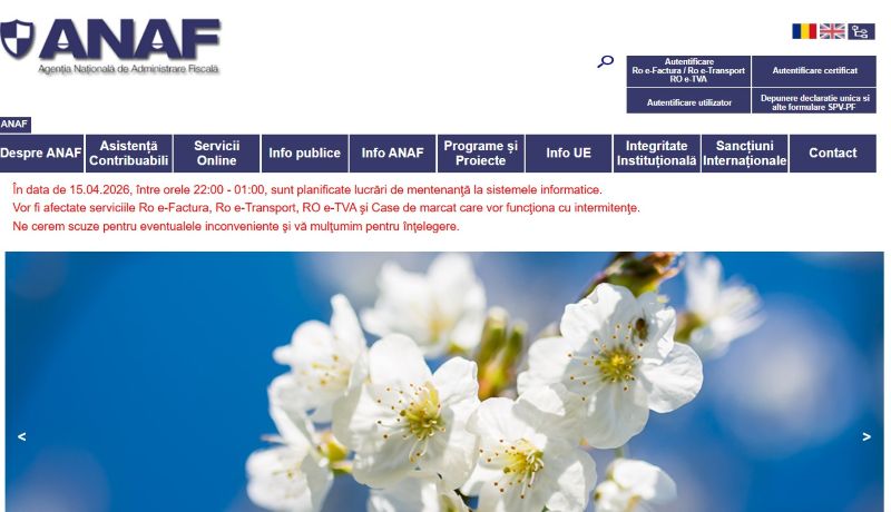 Sistemul informatic al Agenției Naționale de Administrare Fiscală nu va funcționa sau va funcționa cu intermitență, pe 15 aprilie, cu începere de la ora 22:00, până la ora 01:00. În acest timp agenții economici trebuie să știe că vor fi afectate serviciile Ro e-Factura, Ro e-Transport, RO e-TVA și Case de marcat.