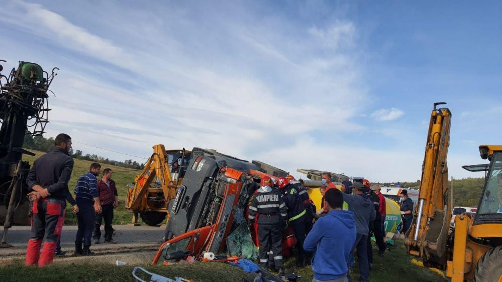 FOTO: Betonieră răsturnată în șanț, victimă rămasă încarcerată