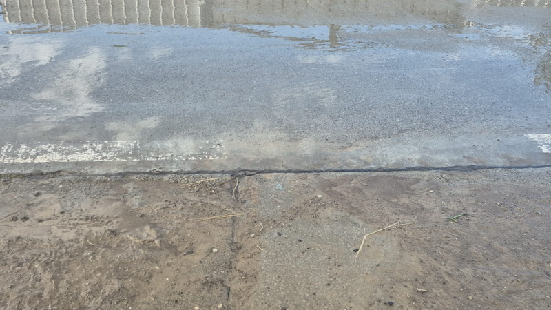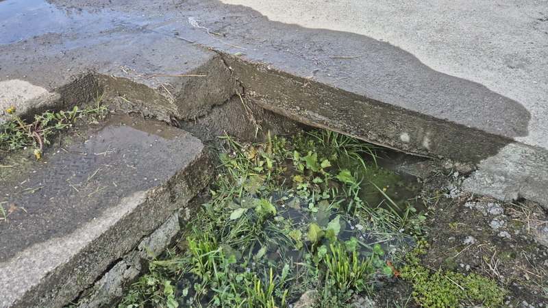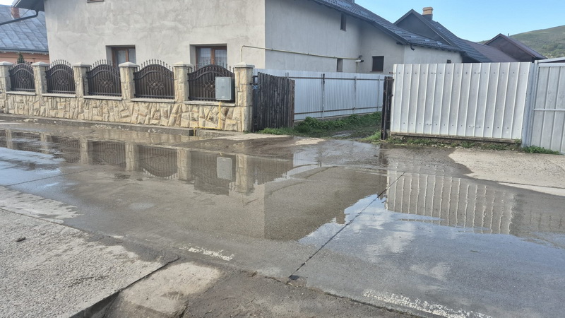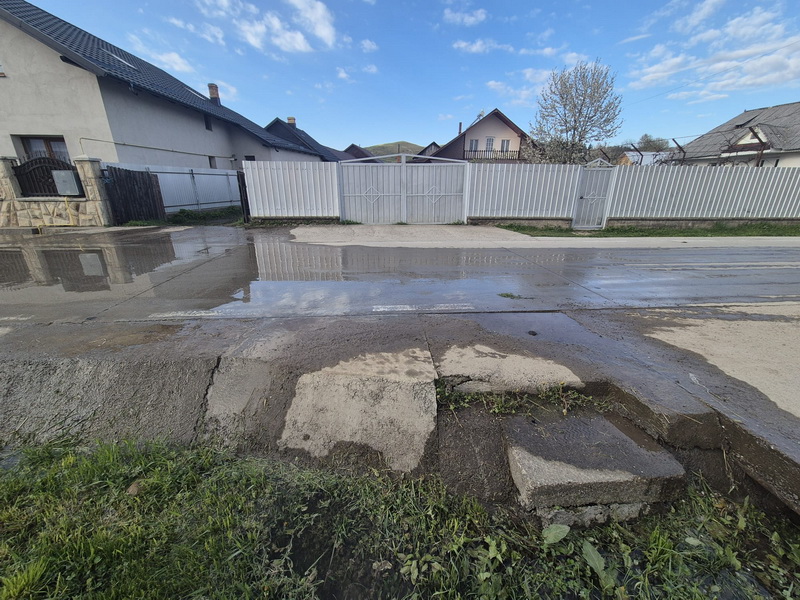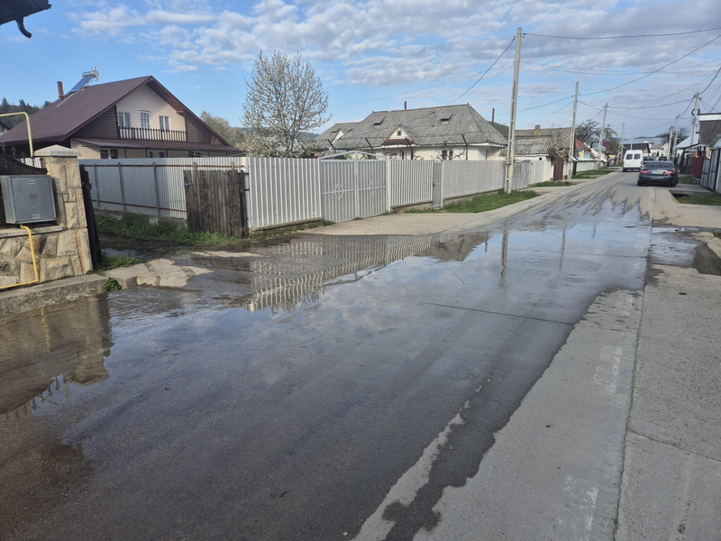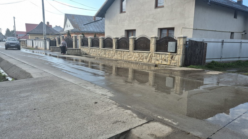 În urma unor sesizări primite de la cetățeni din zonă, problema a fost verificată și confirmată: din asfalt țâșnește apa ca dintr-un izvor, iar șanțurile sunt pline.