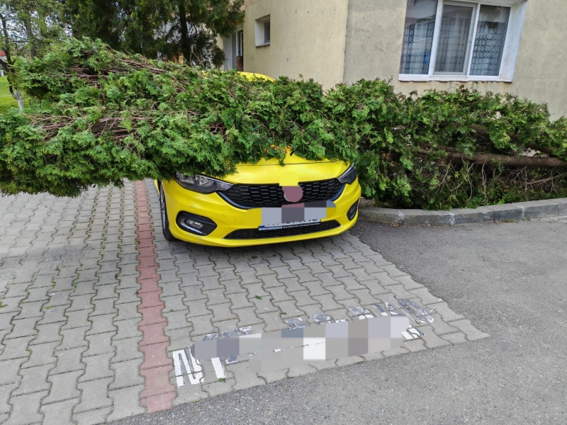 Au apărut probleme și la Roman. Un echipaj ISU și SVSU Roman intervin pentru pentru îndepărtarea unui arbore căzut peste un autoturism de stada Roman Mușat