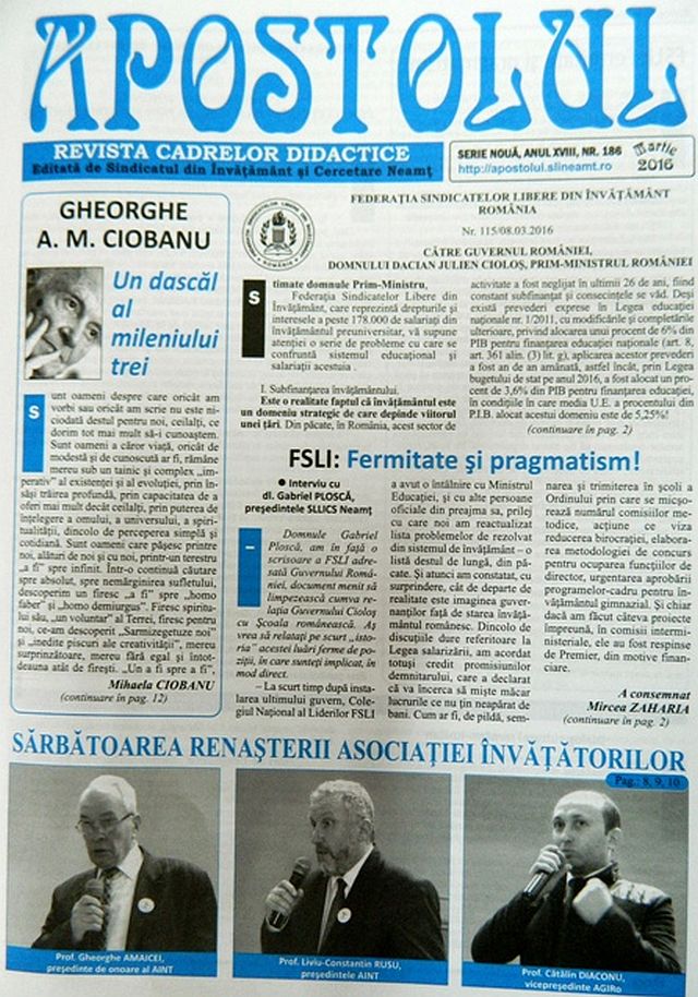 Același număr al apariției editoriale, editată cu sprijinul Sindicatului din Învățământ și Cercetare Neamț, oferă, de asemenea, spații generoase prezentării ultimelor activități intreprinse de Federația Sindicatelor Libere din Învățământ în relația cu Guvernul.