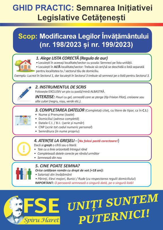 Federația Sindicatelor din Educație „Spiru Haret” a început să strângă între timp semnături pentru o inițiativă legislativă cetățenească, al cărei scop este de a determina Guvernul să anuleze măsurile privind educația luate de cabinetul Bolojan prin legea care stabilește măsurile bugetar-fiscale.