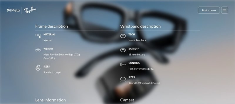 Meta Ray–Ban Display sunt ochelari inteligenți vânduți sub marca Ray-Ban, cu un display color integrat în lentila din dreapta (600×600 pixeli). Pe acest ecran apar informații scurte: mesaje, o hartă pentru mers pe jos, traduceri afișate ca subtitrare sau previzualizări pentru fotografii și clipuri. Controlul se face prin comenzi vocale („Hey Meta”), atingeri pe rame, plus Meta Neural Band, o brățară care folosește EMG (semnale ale activității musculare) pentru gesturi.