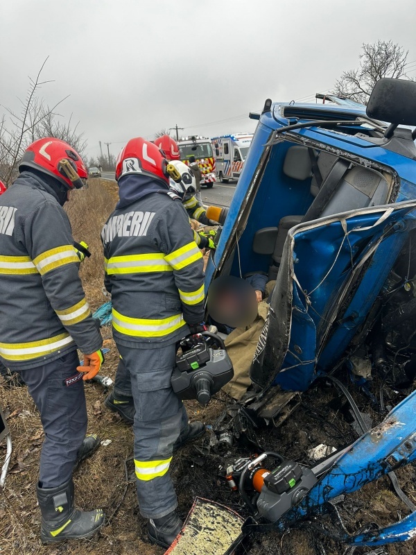 – un bărbat, aflat la volanul autoutilitarei, încarcerat și semiconștient;